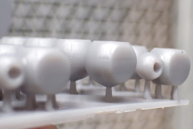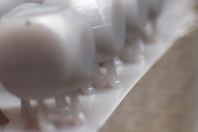 出力時に上になる円錐の側面に垂れ切れず乗ってしまったレジンが硬化して付着してしまっていますが、肉眼では分からないレベルです。これは粘度の低いレジンが発売されれば解決されると思います。